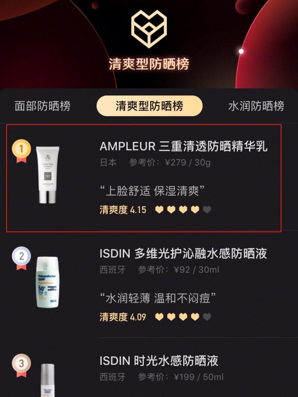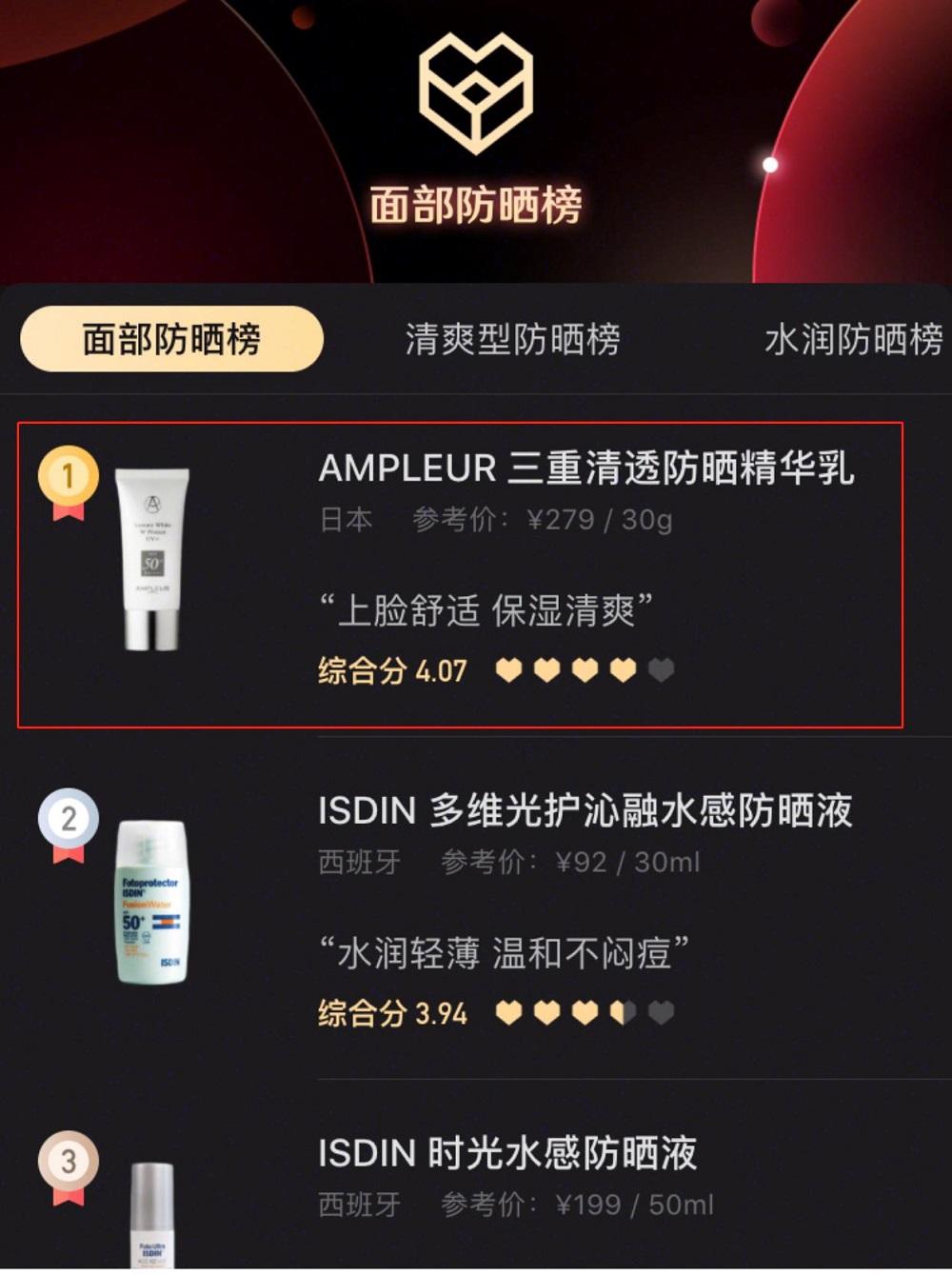 AMPLEUR四季防曬亦是不斷受到明星達(dá)人力薦和種草,連續(xù)兩年蟬聯(lián)小紅心大賞榜單1位。