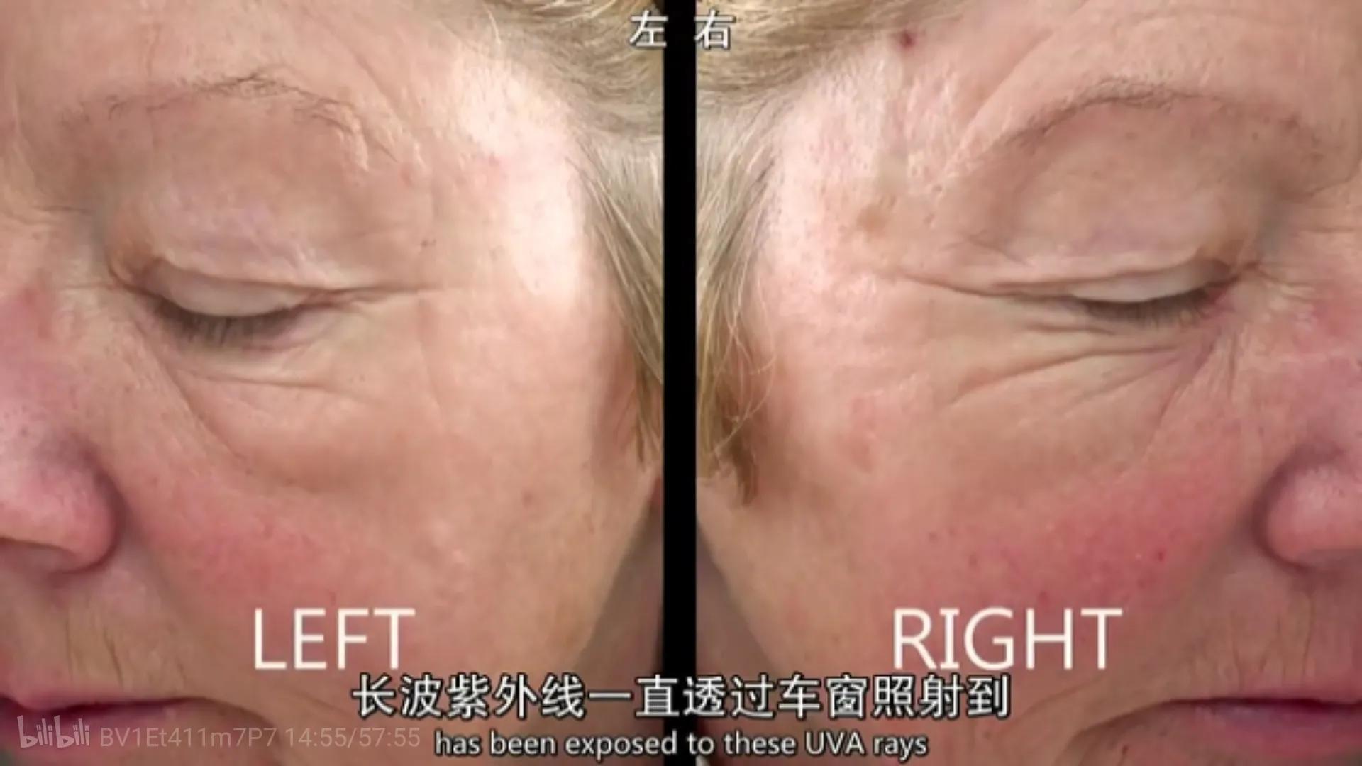 女司機(jī)的右臉比左臉的皺紋多,因?yàn)樗{駛時(shí),右臉經(jīng)常被光照到,長(zhǎng)波紫外線(xiàn)可以透過(guò)玻璃照到臉上(太陽(yáng)的短波紫外線(xiàn)會(huì)曬傷皮膚,但長(zhǎng)波紫外線(xiàn)會(huì)導(dǎo)致皮膚老化),陽(yáng)光為皮膚衰老承擔(dān)了3/4的責(zé)任。