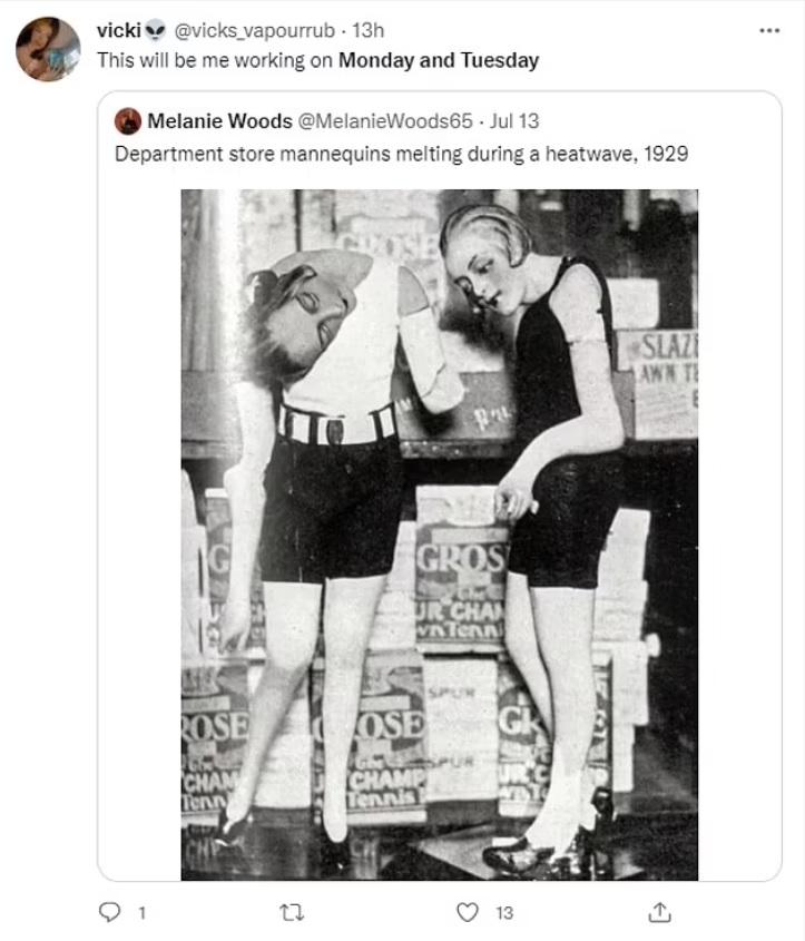 “ ‘櫥窗里的模特人偶在熱浪中化了,1929’我猜周一周二上班的時候,我也會變成這樣?!?/p>