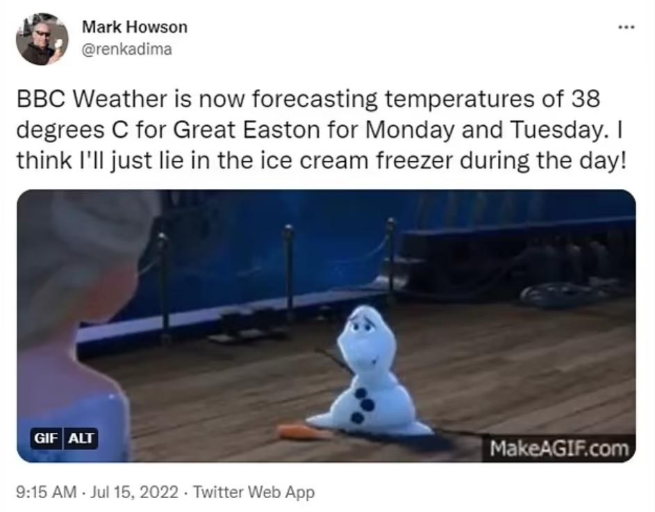 “BBC預(yù)報大伊斯頓將在周一、周二達(dá)到38度。我想到時候我一整天都躺在冰淇淋柜里?!?/p>