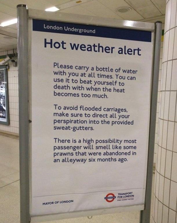倫敦地鐵還發(fā)了一個畫風(fēng)別致的高溫警告:“請隨身攜帶一瓶水。實在熱得受不了,你還可以用它把自己打死。如果不想在車廂里被淹死,請你的汗水都排到排汗槽里。(注:并沒有這樣的東西)走進車廂,很可能絕大部分乘客聞起來就像六個月前丟在小巷子里的臭蝦。”