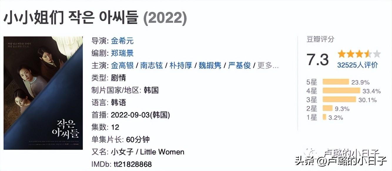 由金高銀主演的《小小姐們》,從名字和海報(bào)來看,妥妥的女性群像劇,豆瓣評分還算過得去,7.3分,屬于值得一看的韓劇。