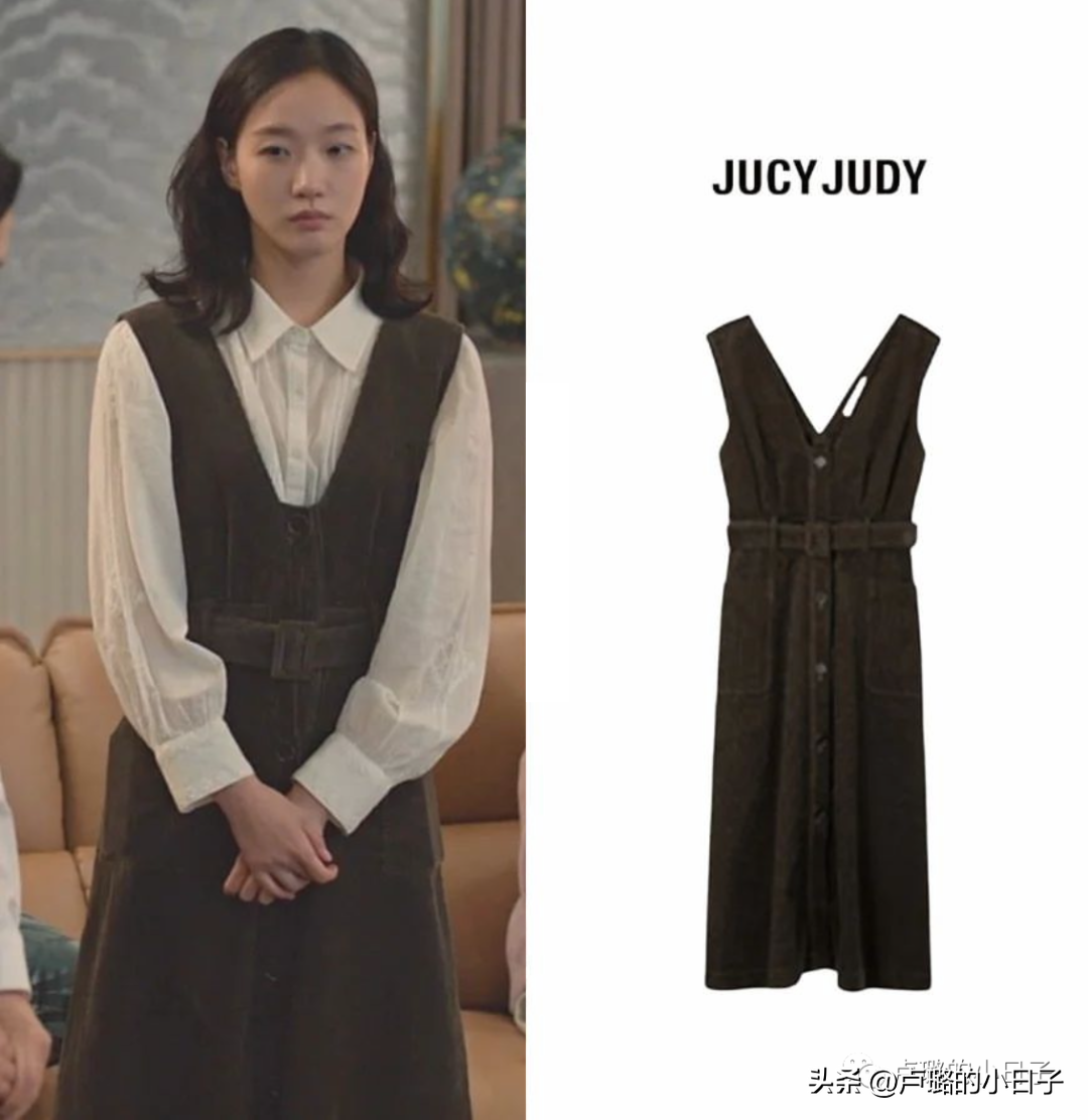 白色襯衫搭配深色V領(lǐng)長裙的這一套裝扮,我也喜歡,而且外搭的裙子也不貴,還是韓國的品牌Jucy Judy,不到900元。