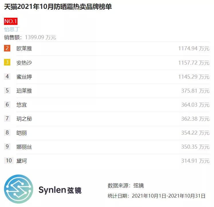 根據(jù)電商數(shù)據(jù)搜索工具——“弦鏡”數(shù)據(jù)顯示,天貓平臺(tái)10月防曬霜熱賣品牌榜單,第一名怡思丁,銷售額為1399.09萬元。第二名歐萊雅,銷售額為1174.94萬元。第三名安熱沙,銷售額為1157.72萬元。從第四名到第十名分別為蜜絲婷、珀萊雅、悠宜、玥之秘、皚麗、娜麗絲、黛珂。