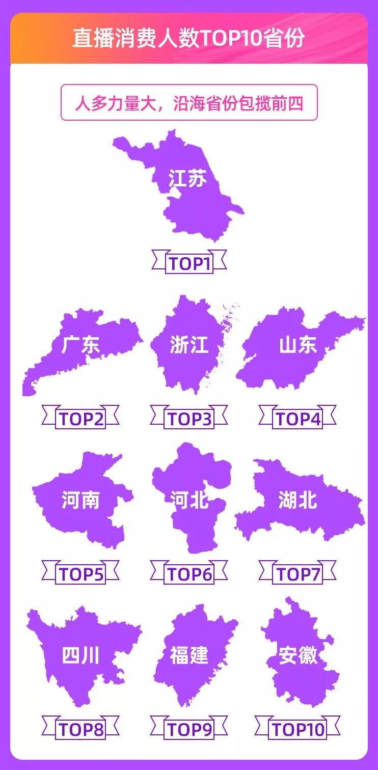 從地域來看,江蘇、廣東、浙江等沿海省份是直播消費人數(shù)的前三大省。河南、湖北、四川、安徽等內(nèi)陸地區(qū)同樣也熱衷在直播間剁手。而不同地方消費者在直播間里愛購買的商品出奇一致,美容護(hù)膚、女裝、洗護(hù)、彩妝等為暢銷。