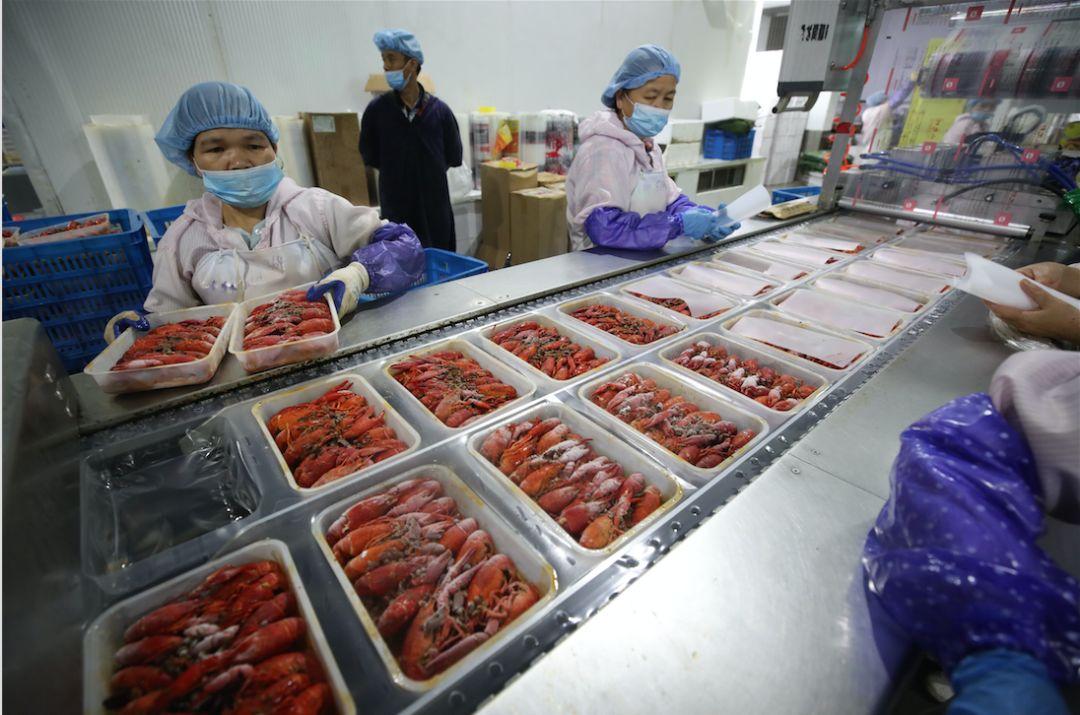 圖:位于湖北石首的小龍蝦生產(chǎn)加工廠,工人正在分裝冷凍調(diào)味后的小龍蝦