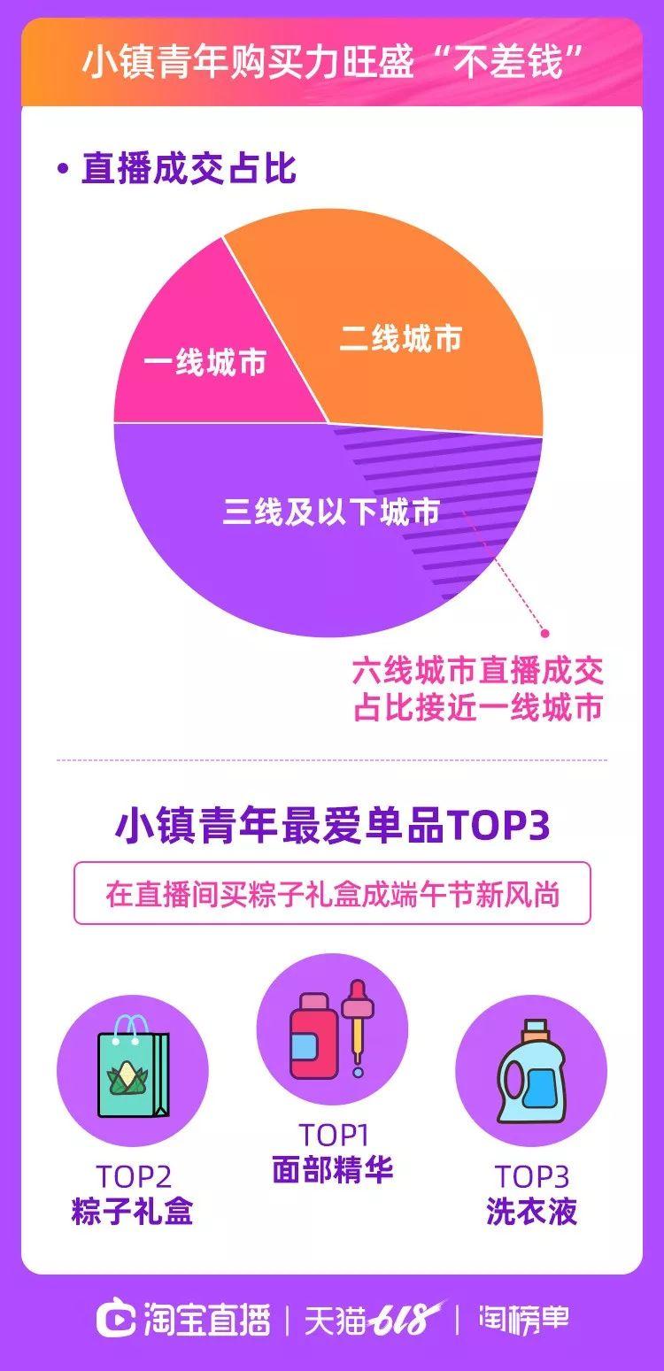小鎮(zhèn)青年在直播間的購買力不容小覷。除了一二線城市的消費者在直播間瘋狂剁手外,三線及以下的城市同樣在618期間貢獻(xiàn)了近一半的直播成交。其中,六線城市的直播成交占比甚至接近一線城市。購買多的商品分別是面部精華、粽子禮盒和洗衣液。隨著低線城市消費能力的釋放,直播間也成為品牌觸達(dá)下沉市場消費者的重要渠道。