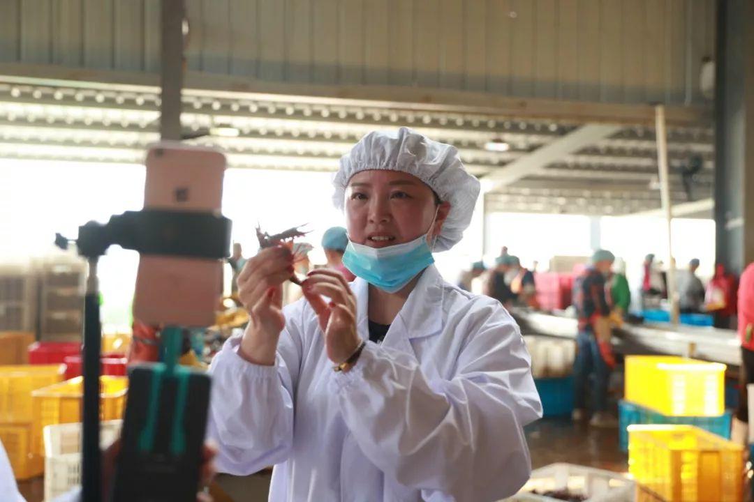 圖:16日,湖北農(nóng)民主播在小龍蝦加工廠探訪直播,當(dāng)天3個小時的直播助銷120萬只小龍蝦