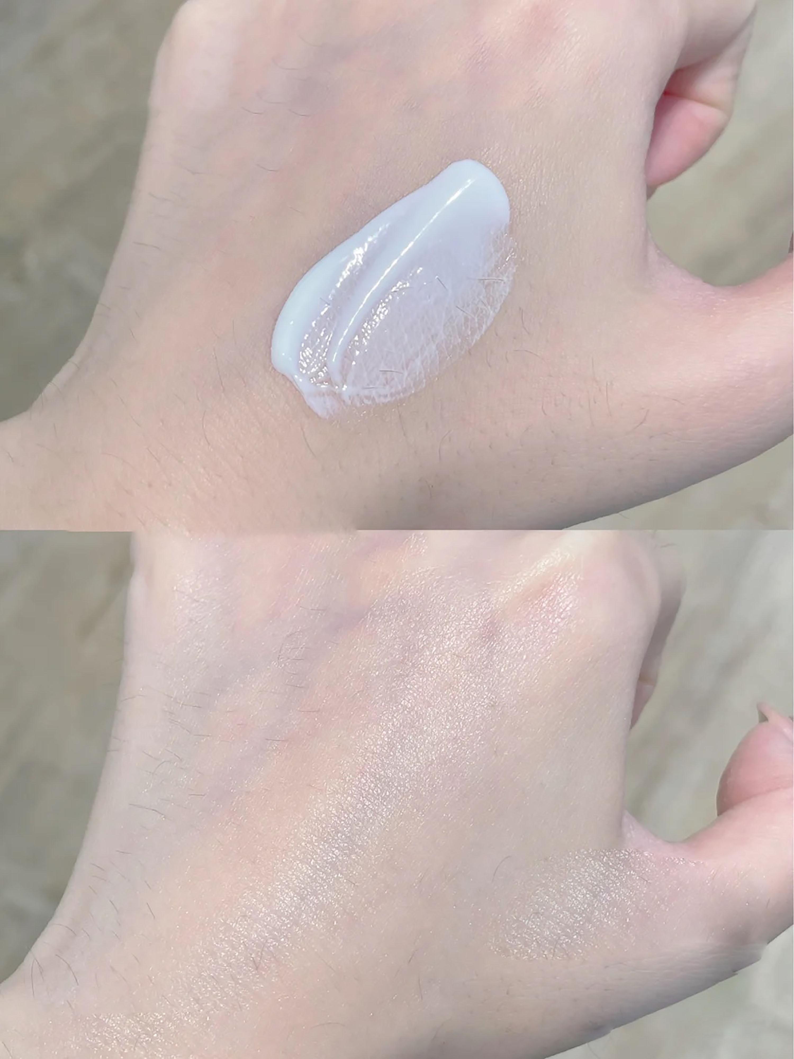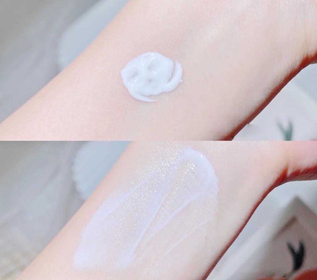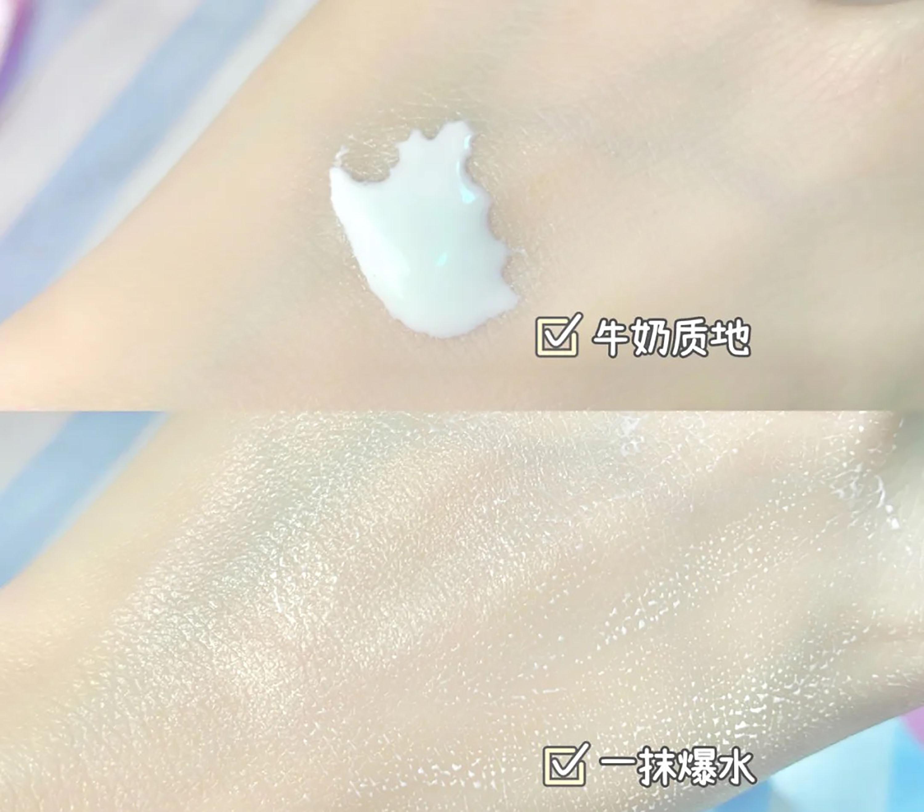 質(zhì)地是很清透的牛奶質(zhì)地,推開后還會爆水珠,的水潤好推開。成膜的速度很快,清爽不粘膩,是很自然的膜感,透氣不悶。