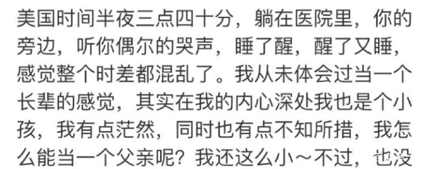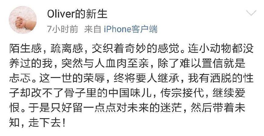 該賬號也接連發(fā)文訴說第一次當(dāng)爸爸的激動心情:“陌生感、疏離感,交織著奇妙的感覺,連小動物都沒養(yǎng)過的我,突然與人血肉至親,除了難以置信就是忐忑,這一世的榮辱,終將要人繼承!”
