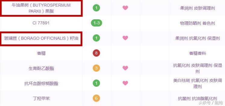 SPF30的防曬值也比較高,滿足日常需求,成分中含有牛油果脂和玻璃苣籽油,能夠起到滋潤(rùn)保濕的果。