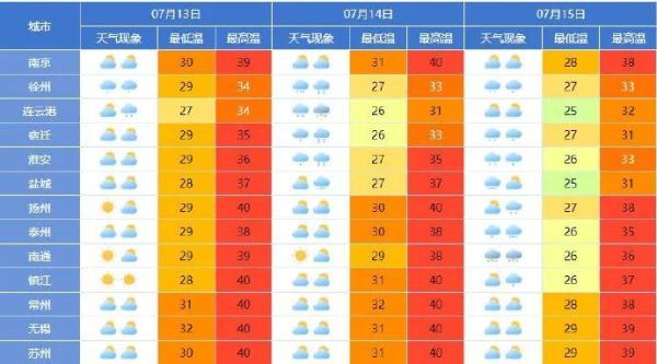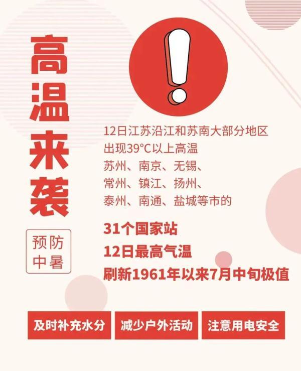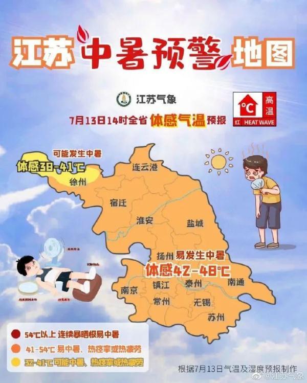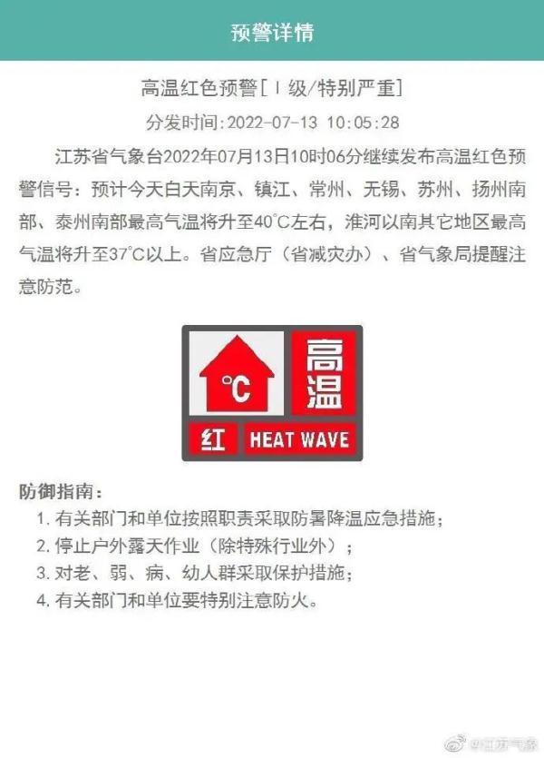 江蘇7月13日繼續(xù)發(fā)布高溫紅色預警,預計今天白天南京、鎮(zhèn)江、常州、無錫、蘇州、揚州南部、泰州南部高氣溫將升至40℃左右,而受濕度等因素影響,實際的體感溫度將更高!
