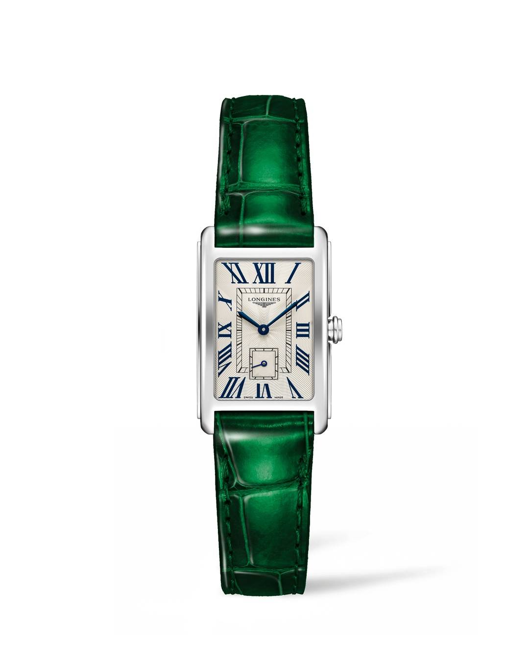 浪琴表黛綽維納系列以意式甜美生活——“Dolce Vita”為靈感,在熱衷享受愜意生活的女士們的手腕上綻放異彩。表款搭載石英機(jī)芯,矩形表殼采用精鋼材質(zhì),表盤飾以銀色復(fù)古放射波紋,6點(diǎn)鐘位置設(shè)小秒盤,綴以羅馬數(shù)字時(shí)標(biāo)和藍(lán)鋼指針,搭配綠色皮質(zhì)表帶。