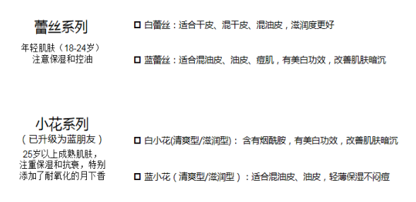 蘇菲娜分臺版和日版,日本的成分和使用感受都比臺灣好不少,當然價格也貴不少。蕾絲系列和小花系列的區(qū)別我做了張圖: