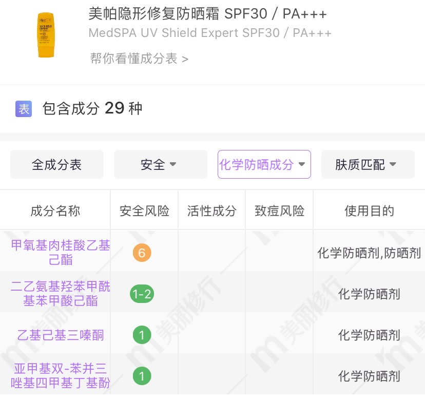 這款防曬屬于化學(xué)防曬+生物防曬。防曬等級為SPF30,PA+++,成分表中包含4種化學(xué)防曬成分,同時這款防曬還包含多種修復(fù)和抗氧化的成分: