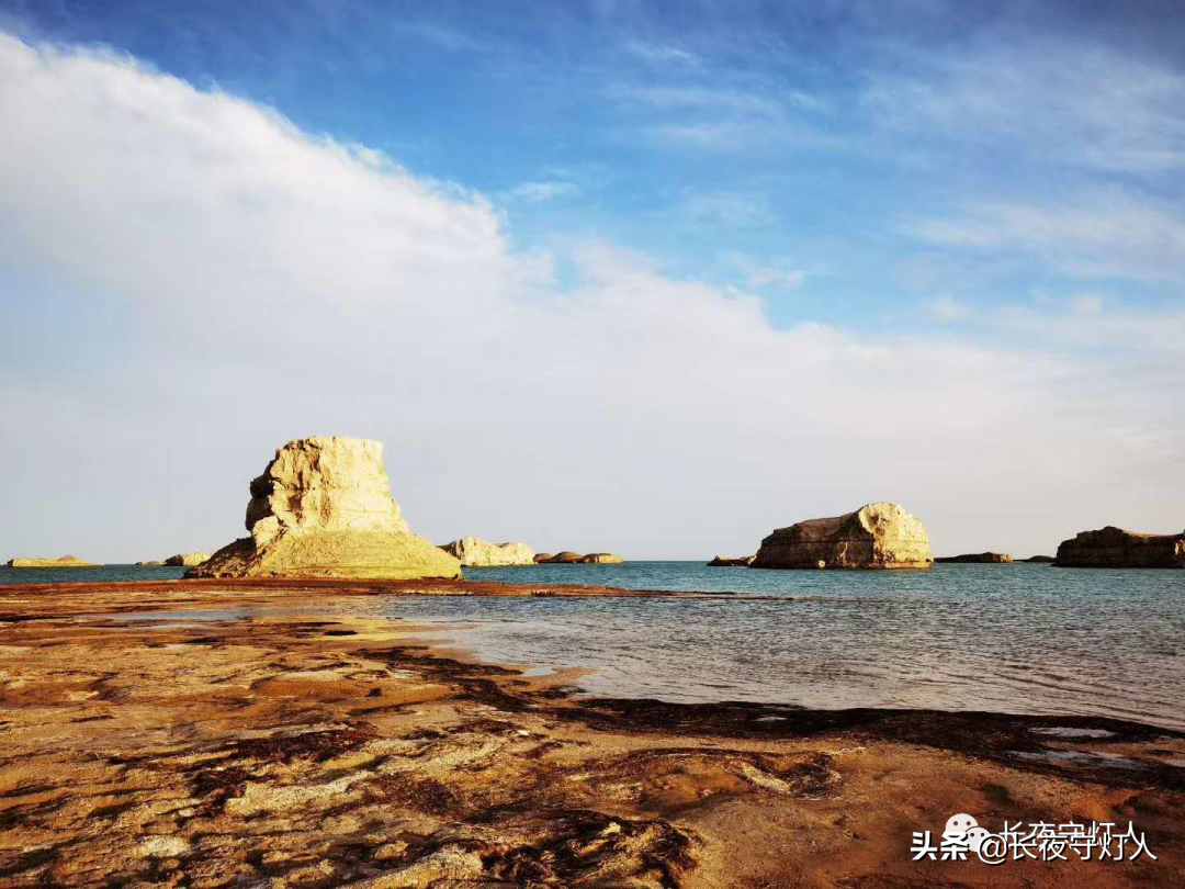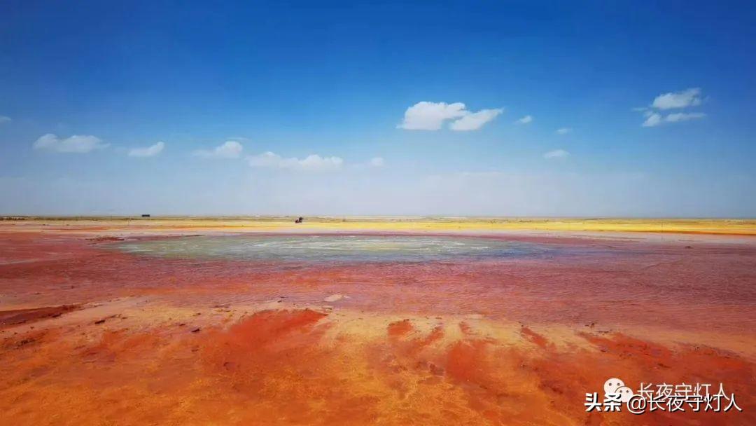 茫崖翡翠湖是我們此行的第一個翡翠湖,有牌子“茫崖翡翠湖”。湖被鹽堿分割成個小塊,或者說在個鹽堿坑里形成了個小湖。鹽堿很結(jié)實,可以在湖里隨意走,日落很美。