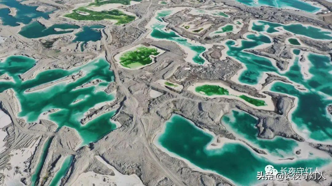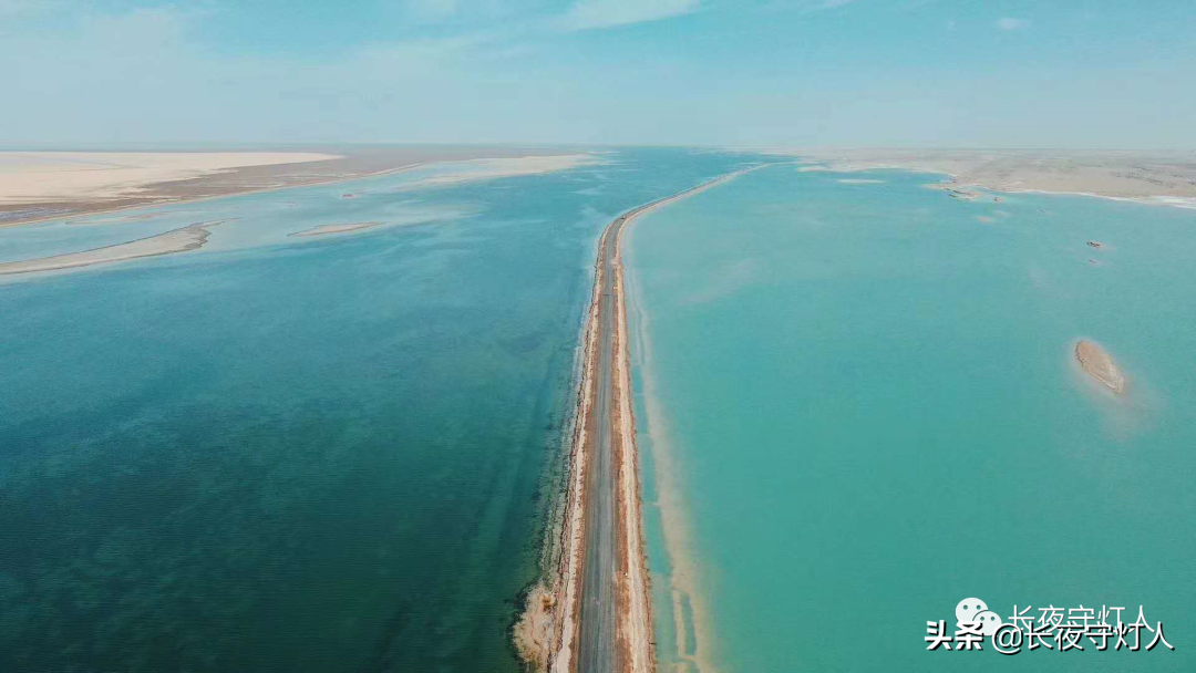 出水上雅丹不久,就到了雙色湖,雙色湖其實就是西臺吉乃爾湖。穿湖而過的公路把湖分成兩半,兩邊的顏色不同,一邊偏綠,一邊偏藍(說到顏色我又詞窮了)。無人機航拍果。