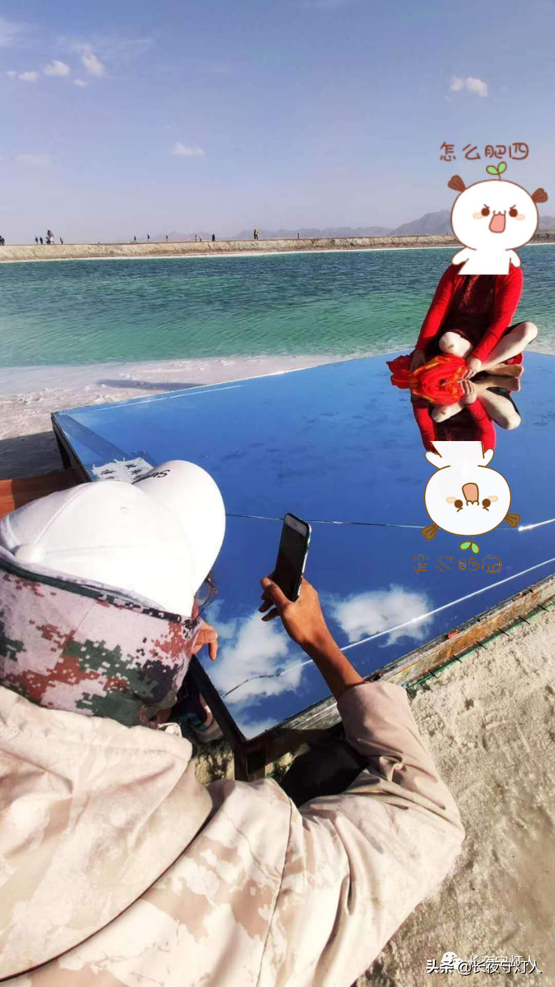 傍晚到達大柴旦翡翠湖。人們一般說的青海翡翠湖,指的就是大柴旦翡翠湖,所以這個湖的牌子只有“翡翠湖”三個字,不像“茫崖翡翠湖”。這個景區(qū)可能太過火爆,游客很多,大媽版的天空之鏡讓我大跌眼鏡,卻排著長隊。所謂的天空之境,居然是在湖邊架起了一塊玻璃,于是可以無視天氣,無視風(fēng)浪。另外還有簡易版的天空之鏡,道具只需一面鏡子,隨處都是天空之鏡。