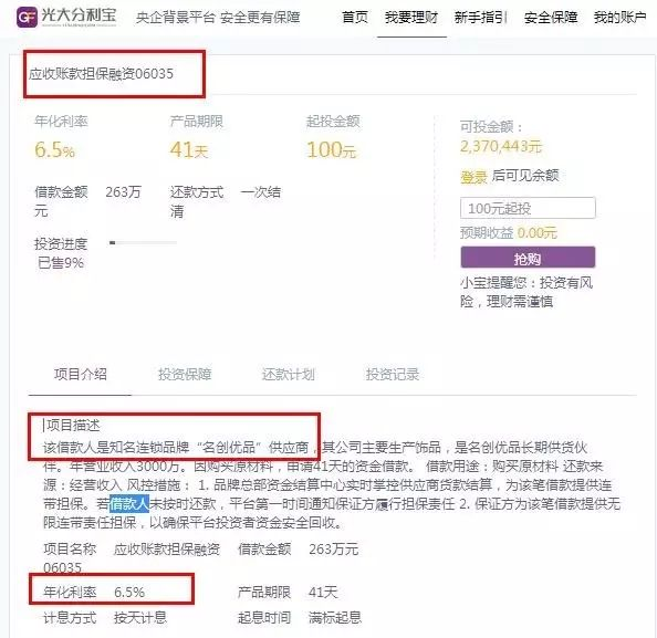 在分利寶曾經發(fā)行的名為“名創(chuàng)瑤海店融資”的產品中,其風控措施中寫道:品牌總部資金結算中心為該筆提供連帶擔保;品牌總部已收取足額加盟金,以平臺投資者資金回收。