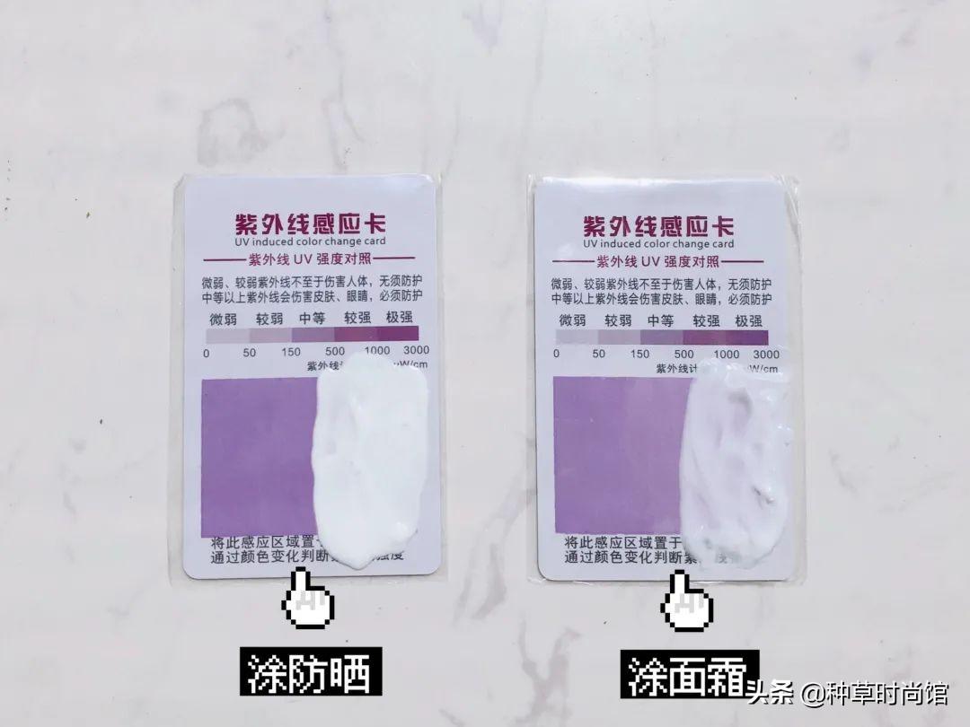 在太陽(yáng)暴曬下,我把兩張紫外線卡分別涂上防曬和面霜做對(duì)比,可以看出涂過(guò)防曬這邊還是白色,而只涂乳液的那一張直接全曬紫了,這下大家知道防曬有多重要了吧!