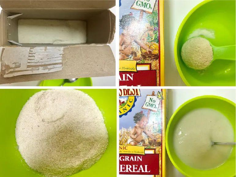 因?yàn)榘b的原因,開袋后能聞見米粉味和紙盒味混合在一塊的味道。另外,這款米粉是糙米米粉,顏色會偏黃像小麥色,聞起來有些米糠的味道。沖調(diào)后質(zhì)地偏稀??诟杏忻紫阄?,甘甜味略多。