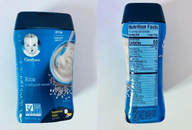 雖然沒有額外添加,但對于米粉中可能存在的游離糖,嘉寶(美國版)和禧貝(美國版)的包裝上會提示:糖(Sugars)含量<6.7g/100g。嘉寶(中國版)則沒有這樣的提示。