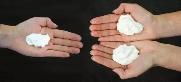 世界衛(wèi)生組織(WHO)建議全身涂抹量為35mL(大約7茶匙)。下圖左顯示的是人們平均的全身用量,而圖右則是科學(xué)用量。WHO指出,用量減少會導(dǎo)致不成比例的功減弱。如果用量減少一半,功會減弱2/3。
