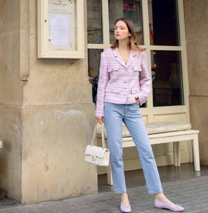 深入骨子里的淑女意象,伴隨著小香風(fēng)款款而來(lái)。雄渾的經(jīng)典力量,歷久考驗(yàn)。淺粉色外套,利落不失溫柔,搭配淺藍(lán)牛仔褲,一粉一藍(lán)相得益彰。