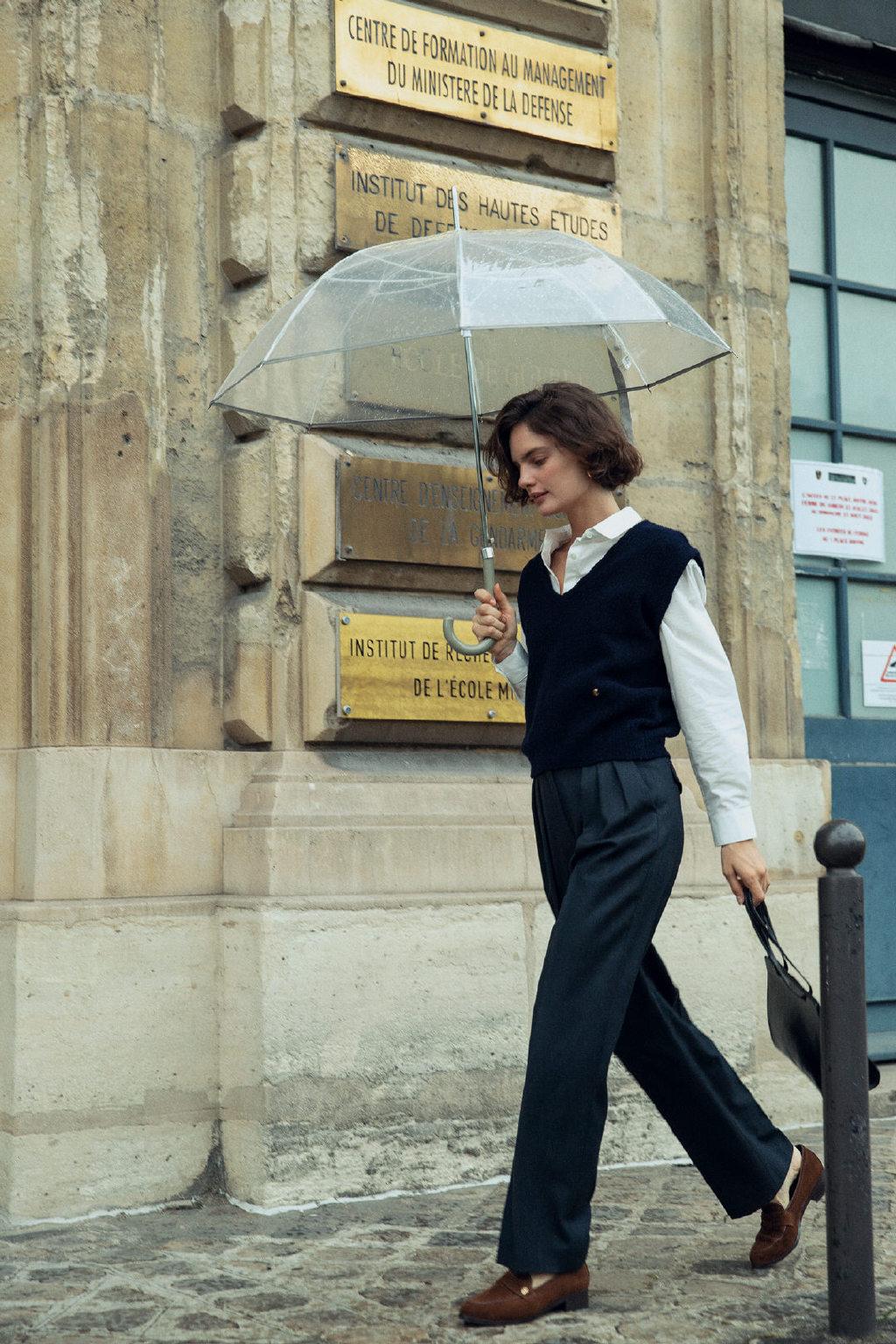 白襯衫搭配黑色馬甲,再來(lái)一條深色西褲,儼然一個(gè)中性人!于是,深棕色樂(lè)福鞋點(diǎn)綴,算是對(duì)優(yōu)雅有一個(gè)交待。