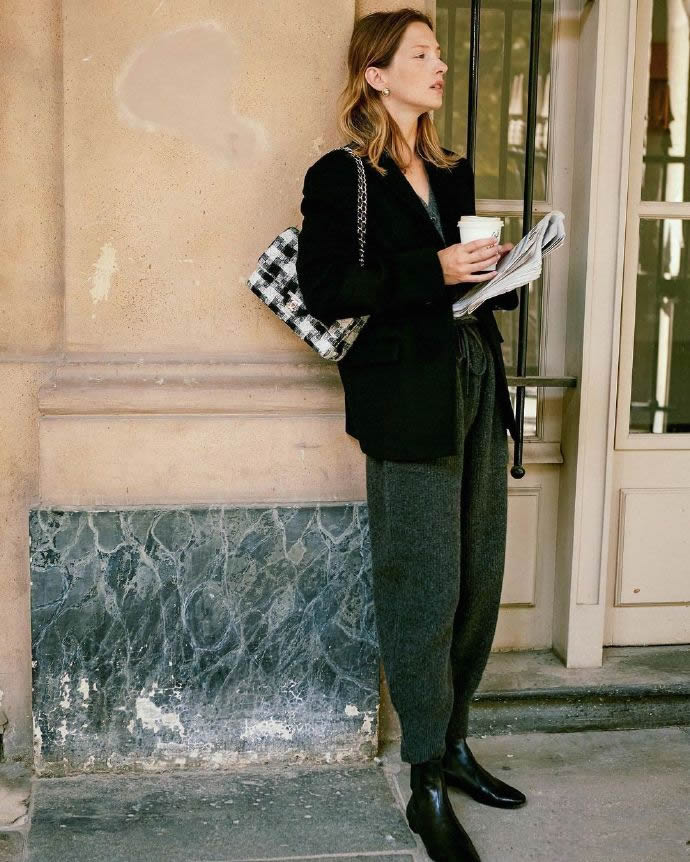 像這套黑灰配,西裝與針織衫、休閑褲的不期而遇,制造出嚴(yán)謹(jǐn)下的一抹小俏皮。原本正經(jīng),誰(shuí)料休閑風(fēng)的暗暗隨行,竟是破解沉悶、突出時(shí)尚的得體之法。