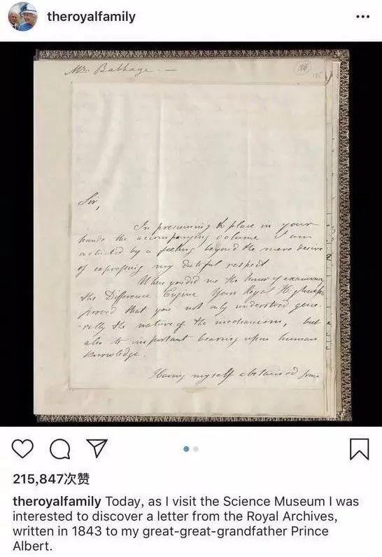 93歲的英國女王在參觀科學(xué)博物館之后,用iPad在皇室官方賬號上分享了數(shù)學(xué)家查爾斯·巴貝奇寫給維多利亞女王丈夫阿爾伯特親王的信件圖片,并表達了自己當(dāng)下的感受。