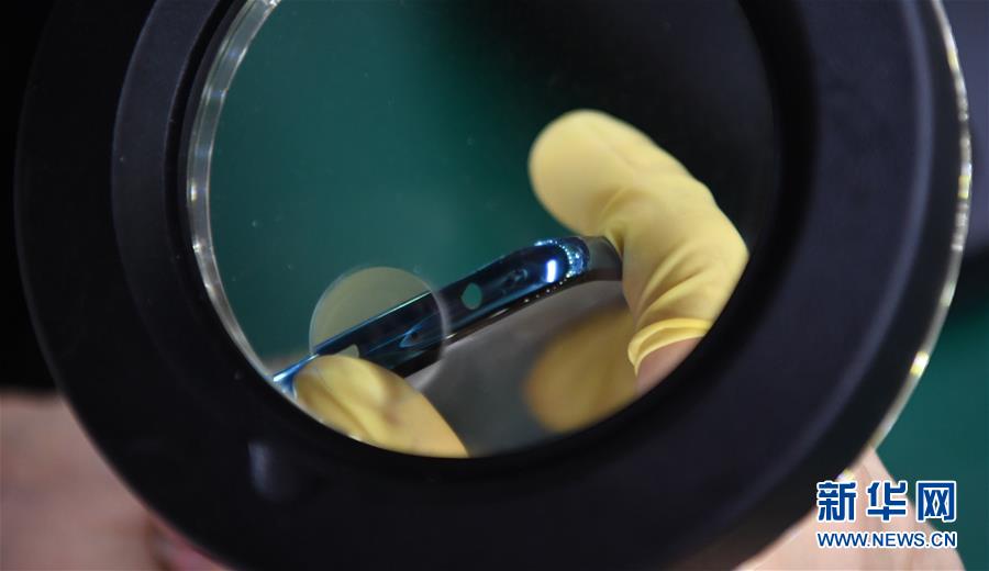 在廣東東莞長安鎮(zhèn)的捷榮技術公司車間內(nèi),員工透過放大鏡檢查手機殼產(chǎn)品(7月16日攝)。 新華社記者 鄧華 攝
