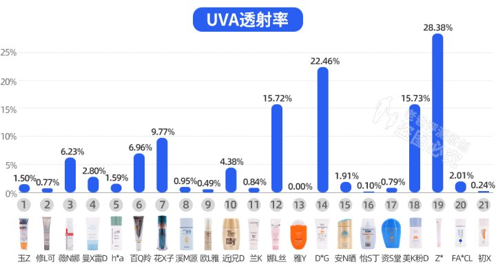 并使用紫外照度計(jì)測得每款樣品的 UVA 透射率——