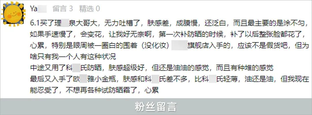 二、防曬力和膚感只能二選一?我們在征集時(shí),看到了這樣的留言:某品牌防曬霜成膜慢、泛白還涂不勻,讓人心累