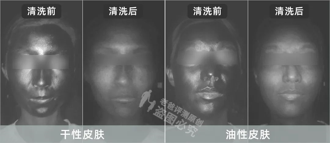 下午 6 點(diǎn)用同一款清潔力中等的氨基酸洗面奶進(jìn)行清洗,并再次用紫外線相機(jī)拍照,通過前后兩張照片對比,判斷是否可以清洗干凈。
