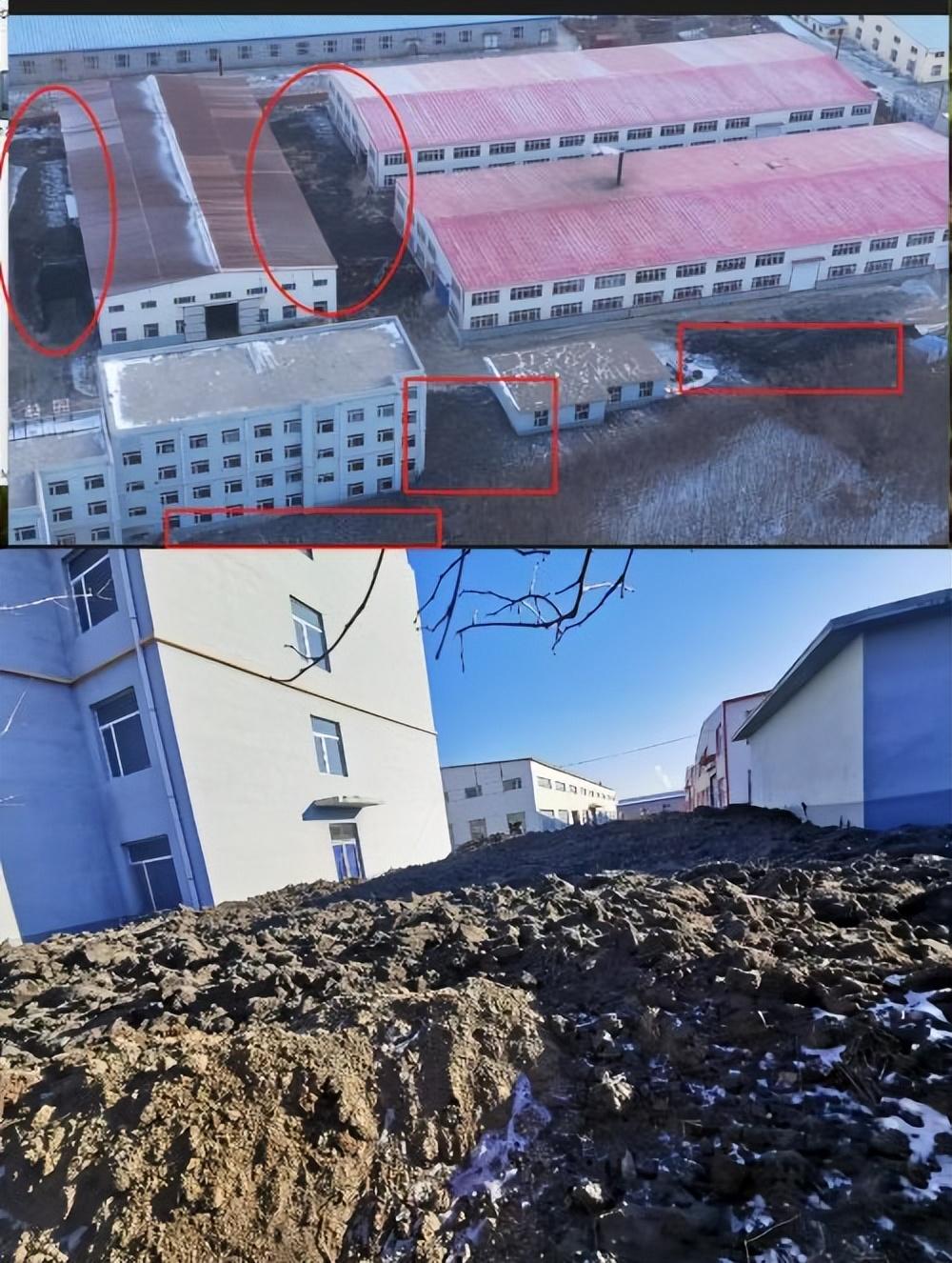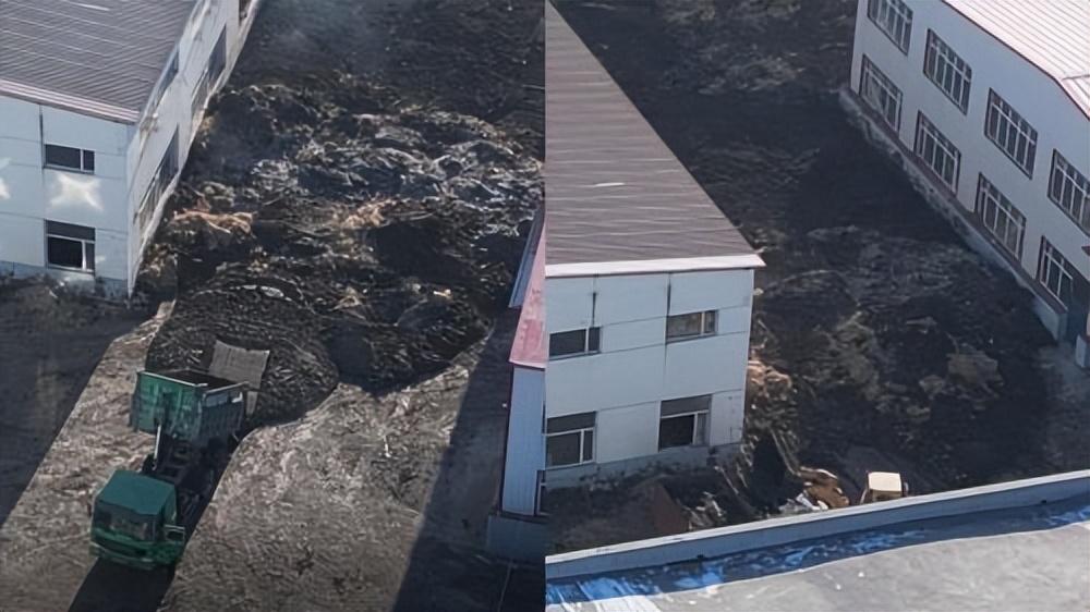 從愛斯特上空看,廠區(qū)如同被“淹沒”在污泥中。除一條主干道外,其余空地幾乎都堆著污泥,有的地方高度逼近廠房窗沿。部分污泥上撒了一些秸稈,此外沒有任何遮擋。約零下10℃的氣溫下,污泥上凍前流淌的形狀依稀可辨。
