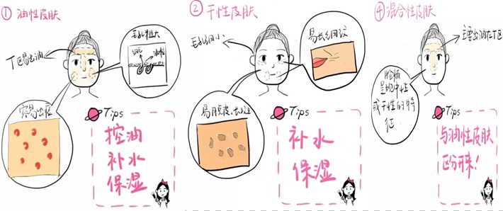 除此之外,還有一些皮膚特征,可以幫助你判斷你自己的皮膚類型。譬如干皮一般會出現(xiàn)紅血絲、角質(zhì)層很薄、很容易過敏的現(xiàn)象,油皮的話一般會出現(xiàn)毛孔粗大、臉色蠟黃、容易長粉刺閉口的現(xiàn)象。