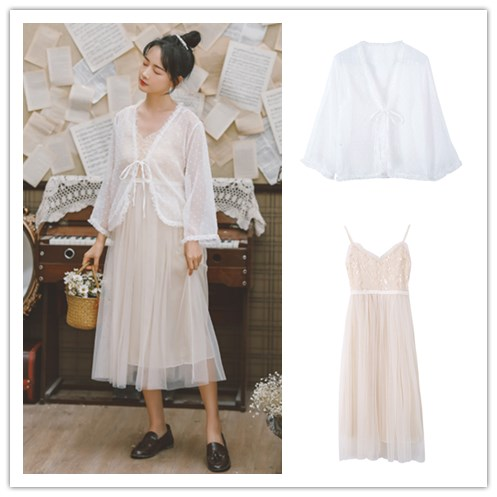 5、薄紗寬袖綁帶防曬衫+高腰吊帶紗裙