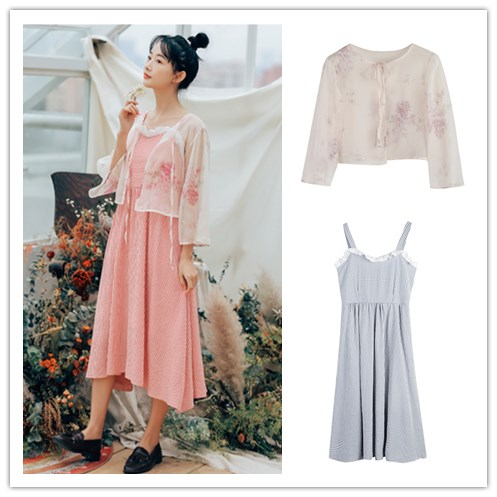 3、短款綁帶小斗篷款防曬衫+吊帶高腰格子裙