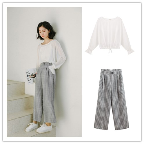 2、寬領(lǐng)小罩衫+高腰千鳥格闊腿褲