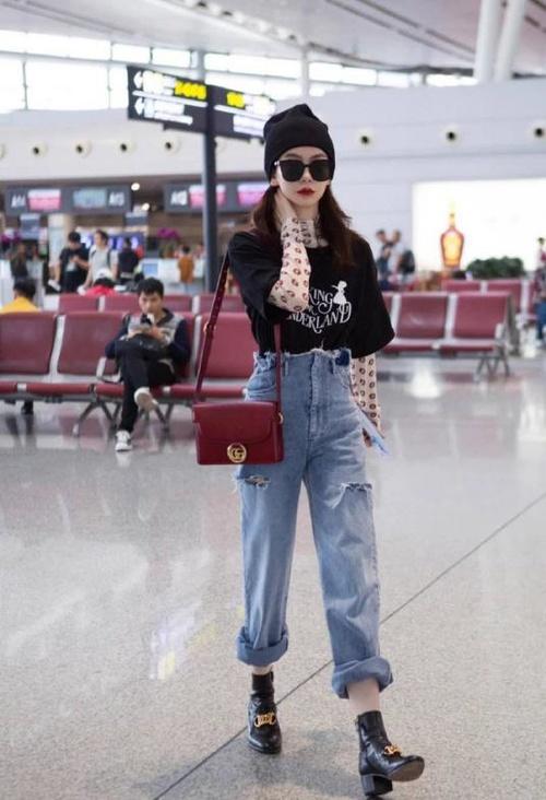 國內(nèi)另一個時尚潮人戚薇,怎么能不趕上這個時尚潮流~同樣是經(jīng)典黑白搭,不過七哥內(nèi)搭的是有紅色印花的防曬衫,更顯俏皮,印花圖案設(shè)計為她的氣質(zhì)添了幾分帥氣,搭配破洞牛仔褲,時髦感噌噌噌上漲!