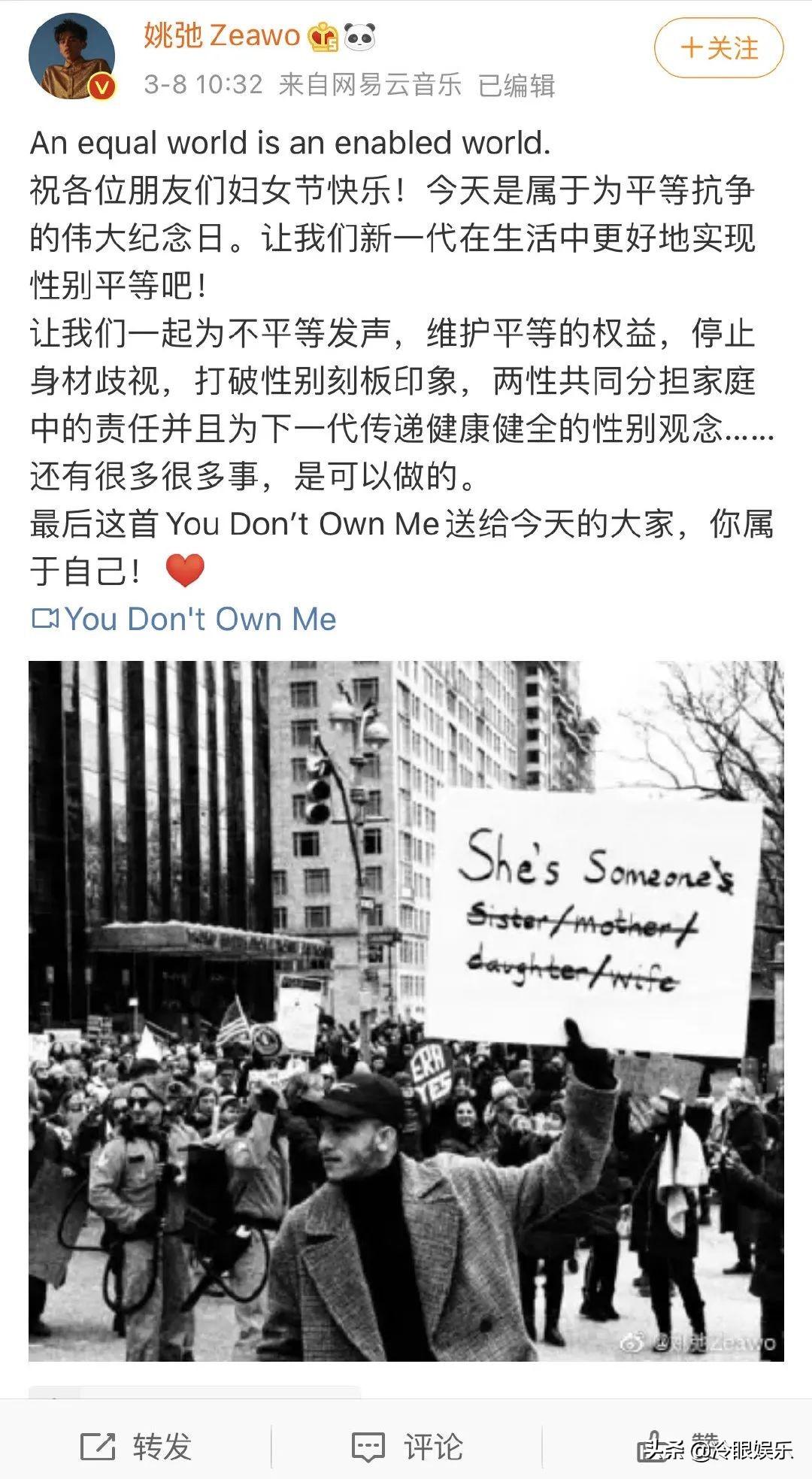 三八婦女節(jié)的時(shí)候他會(huì)發(fā)微博說(shuō)“今天是屬于為平等抗?fàn)幍膫ゴ蠹o(jì)念日”。
