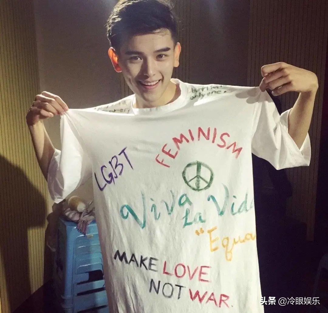 這不是他作為一個(gè)藝人給自己立的人設(shè),因?yàn)樵诟绺?,在還是素人時(shí)期的微博里,姚弛就穿過(guò)自己手繪的,寫著LGBT、女性主義、反戰(zhàn)、生命無(wú)上等等標(biāo)語(yǔ)的T恤。