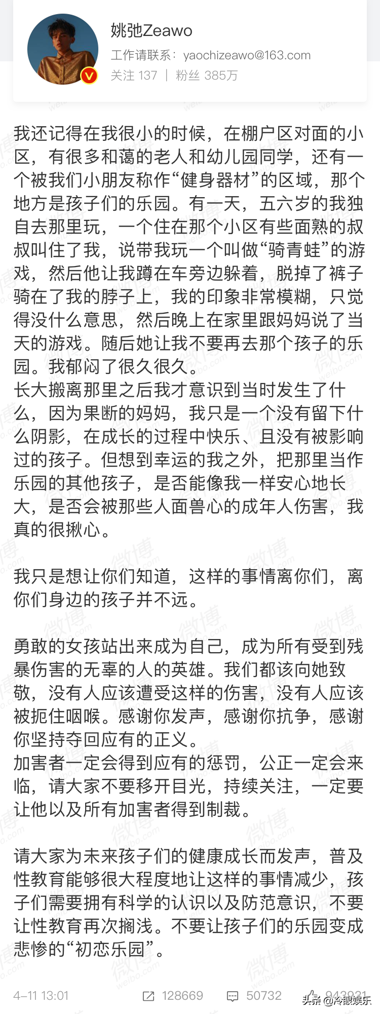 鮑毓明事件被廣泛關(guān)注那會(huì),有很多男明星都轉(zhuǎn)發(fā)過(guò)人民日?qǐng)?bào)的微博表示“哥哥來(lái)了”再配兩個(gè)憤怒表情,但姚弛沒(méi)轉(zhuǎn)微博也沒(méi)打tag,他只發(fā)了一段與自己有關(guān)的童年經(jīng)歷,呼吁大家為孩子的健康成長(zhǎng)發(fā)聲,不要讓性教育擱淺。