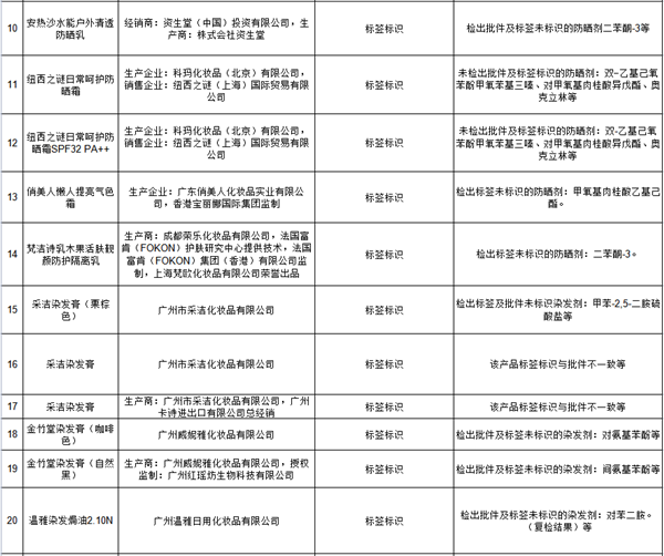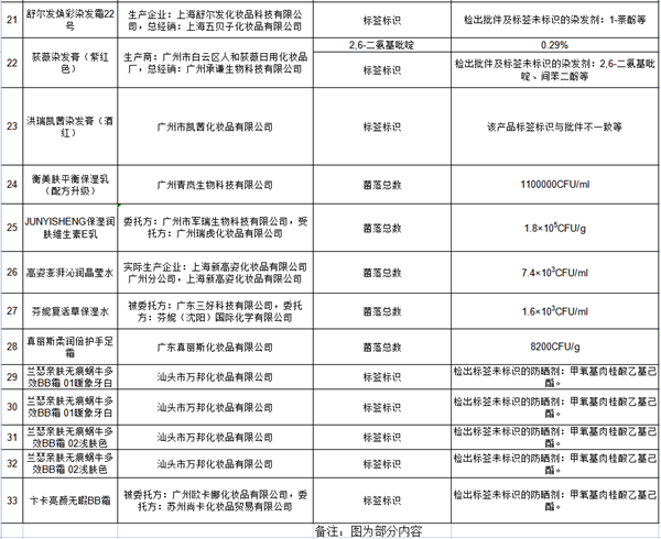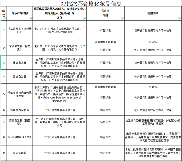 通告顯示,在2021年化妝品監(jiān)督抽檢工作中,經(jīng)河南省食品藥品檢驗所等單位檢驗,標示為廣州市采潔化妝品有限公司生產(chǎn)的采潔染發(fā)膏、廣州市凱茜化妝品有限公司生產(chǎn)的洪瑞凱茜染發(fā)膏、廣州漢典化妝品有限公司生產(chǎn)的漢典染發(fā)膏(葡萄紫)、上海新高姿化妝品有限公司廣州分公司生產(chǎn)的高姿澎湃沁潤晶瑩水、廣東真麗斯化妝品有限公司生產(chǎn)的真麗斯柔潤倍護手足霜等33批次化妝品不合格。其中14批次不合格產(chǎn)品標簽上標示的化妝品注冊人、備案人、受托生產(chǎn)企業(yè)、境內(nèi)責任人(經(jīng)銷商)否認生產(chǎn)或者進口過上述產(chǎn)品。