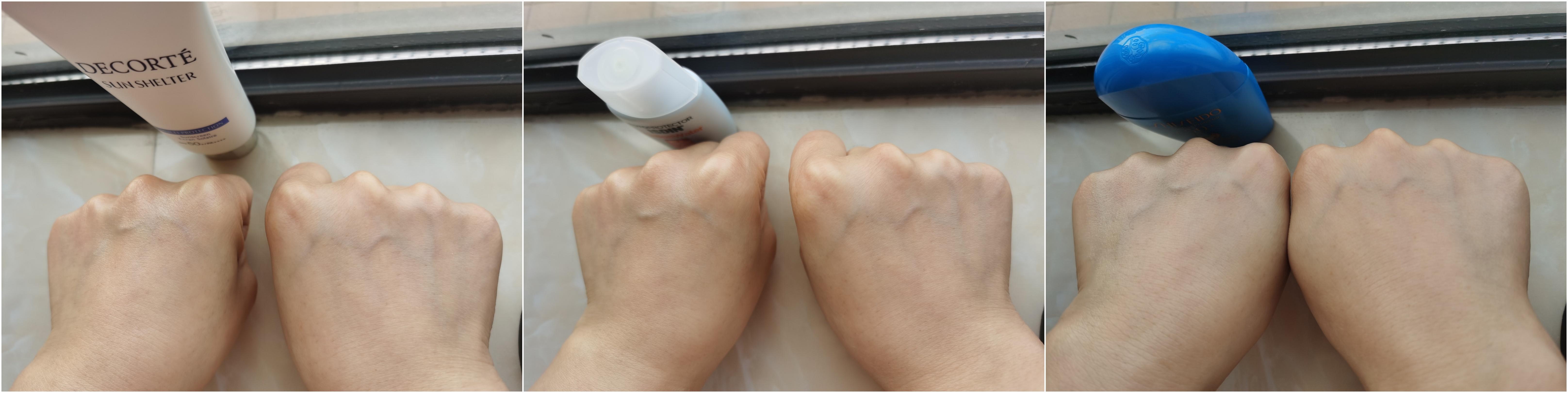 7、泛白情況測試樓主將防曬霜均勻地涂抹在左手手背上,靜待吸收后,與右手未擦防曬霜的手背進(jìn)行對比。為了測試更為客觀,每款測試后及時(shí)清洗干凈手背后再進(jìn)行下一款測試。下面再次有請9位佳麗出場表現(xiàn):