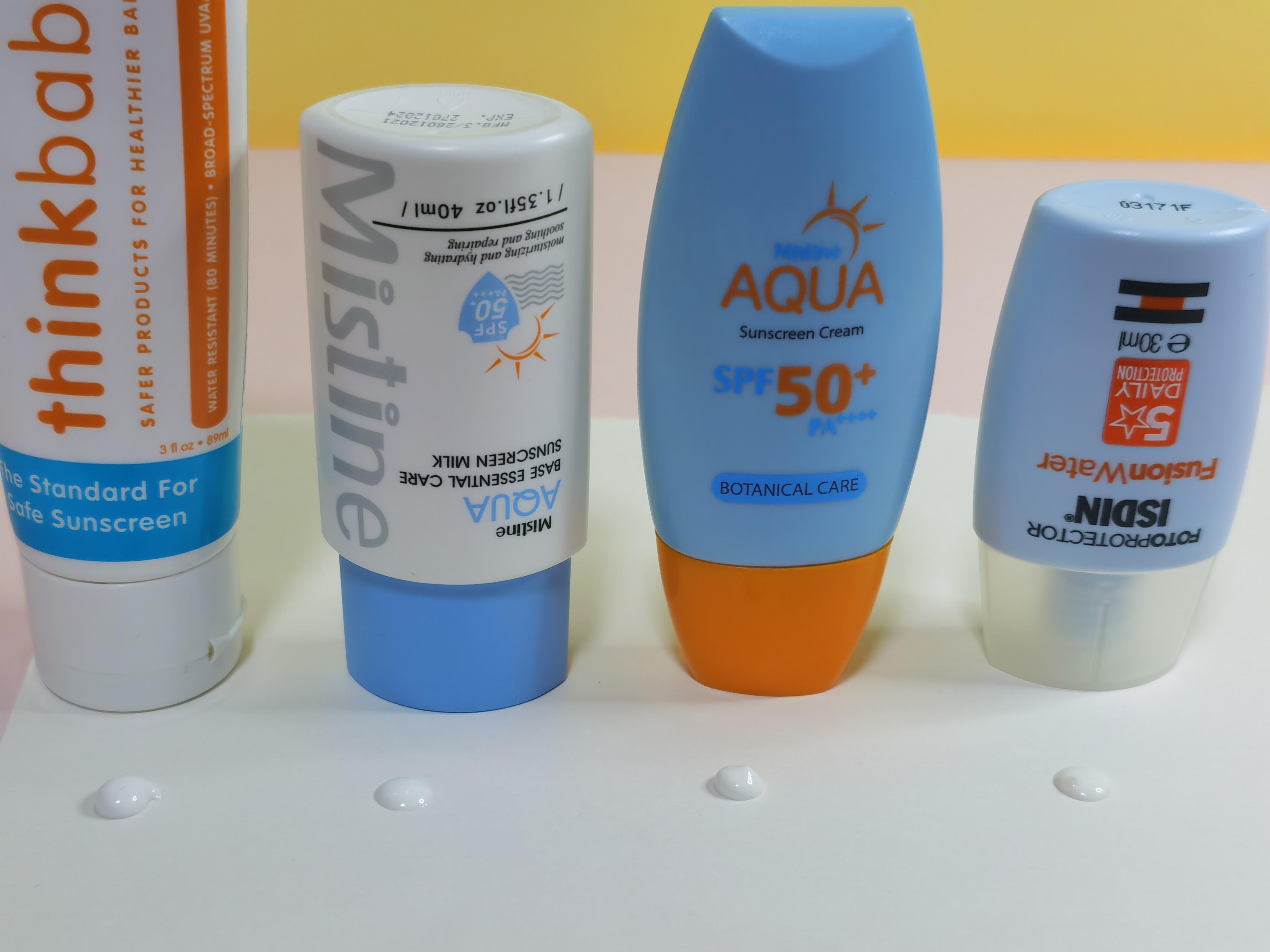 第二組依次是Thinkbaby(霜狀質(zhì)地)、蜜絲婷水感小藍(lán)帽(乳液質(zhì)地)、蜜絲婷小黃帽(乳霜質(zhì)地)以及怡思?。ㄈ橐嘿|(zhì)地)。
