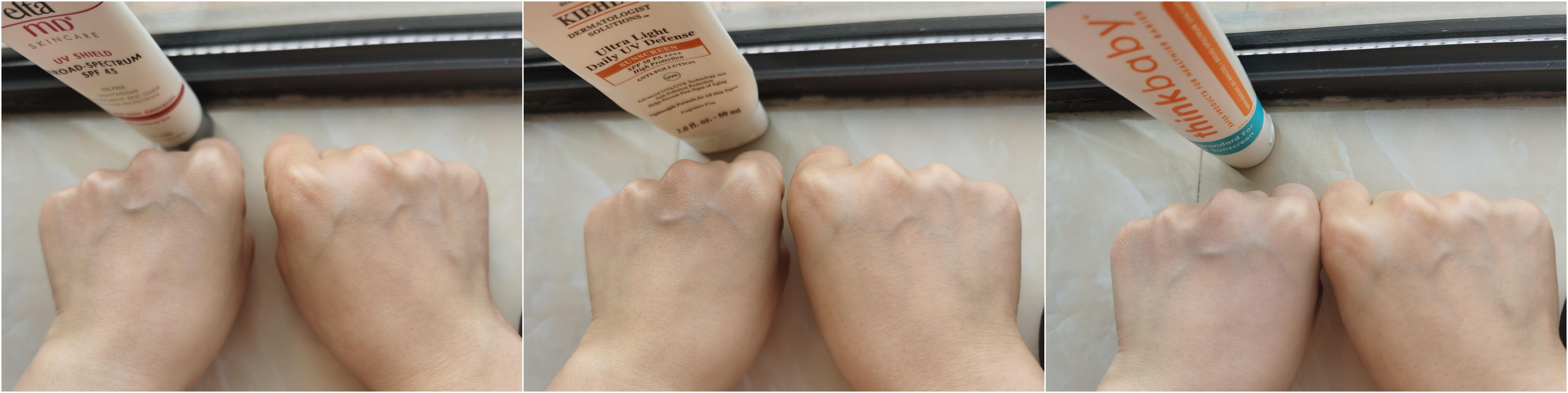 3、質(zhì)地展示第一組依次是黛珂(乳液質(zhì)地)、科顏氏(半霜狀乳液質(zhì)地)、EltaMD(霜狀質(zhì)地)、安耐曬(乳液)、藍(lán)胖子(乳液質(zhì)地)。