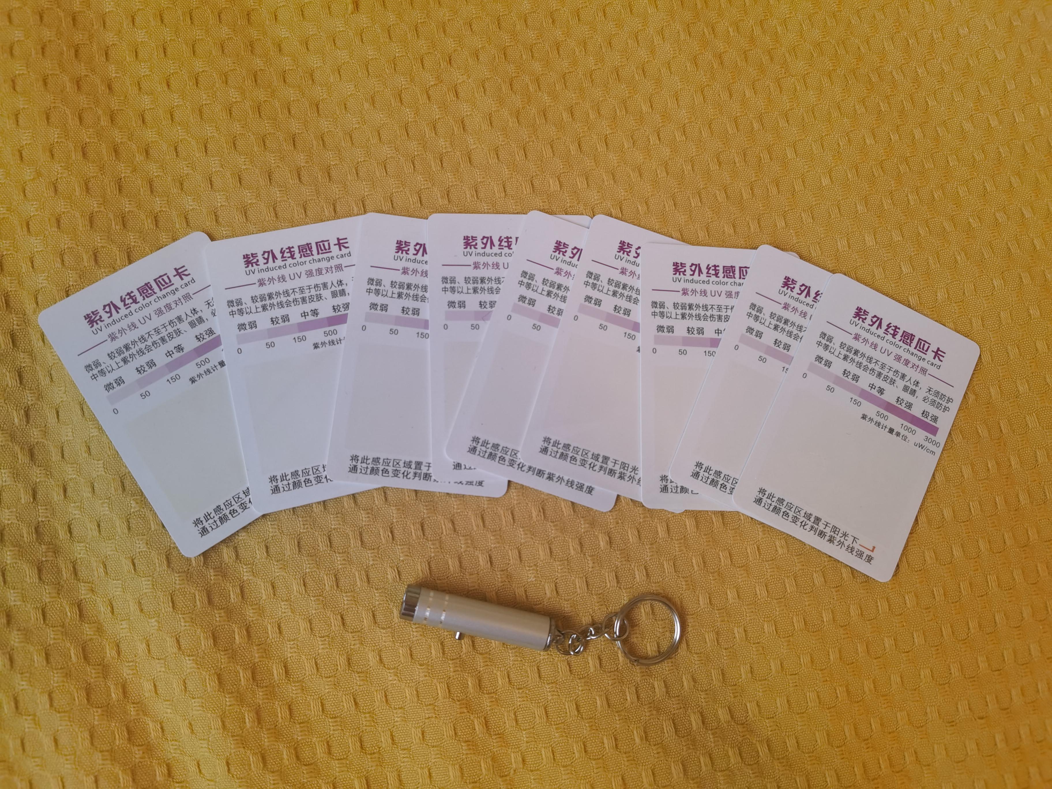 1、防曬能力測試樓主使用紫外線燈光筆代替陽光中的紫外線,每一款防曬霜分別對應(yīng)涂抹一張紫外線感應(yīng)卡,依次使用紫外線燈光筆在同等位置照射5秒后,對比卡片中的顏色變化,顏色越淺,則代表防曬能力越強(qiáng)。