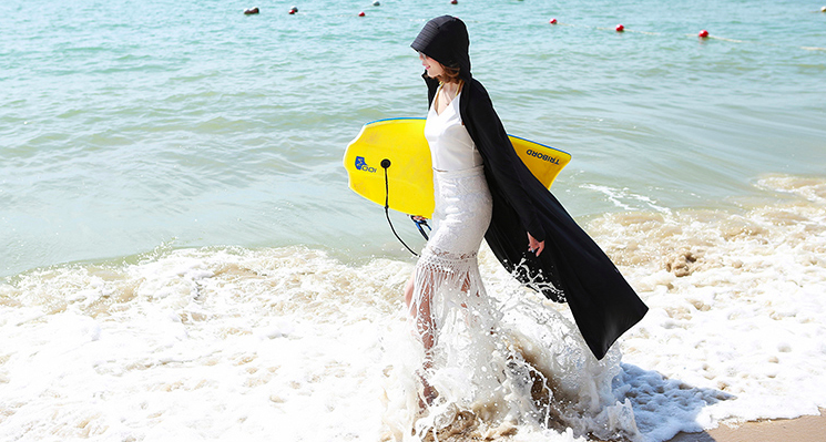 采用的是 84% 錦綸+16% 氨綸的復(fù)合布料,防護(hù)力度 UPF 50+。